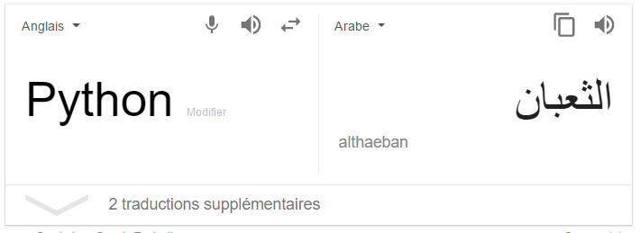 هذه هي النتيجة إن قمت بترجمة كلمة Python في ترجمة جوجل ,في الحقيقة الاسم مستوحى من فرقة مسرحية كانت تطلق على نفسها اسم مونتي بايثون أو Monty Python ,لا أعلم سبب هذه التسمية وهو غير مهم على كل حال.