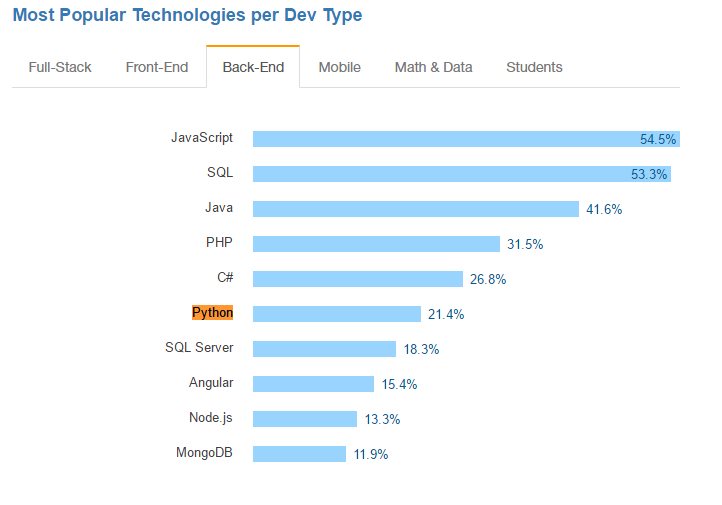 في استطلاع رأي قام به موقع Stackoverflow جاءت بايثون في الرتبة السادسة في صنف ال Back-End وهذا تلميح على شهرة هذه اللغة.