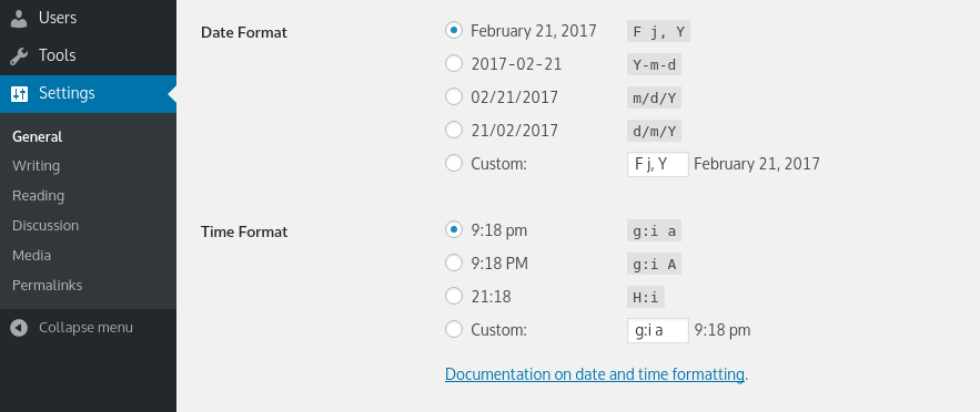 افتراضيًا، ستعرض هذه الوظائف أو تعيد التاريخ والوقت بالتنسيق الذي تم ضبطه في الإدارة > الإعدادات > عام. هذا هو المكان الذي سيتم فيه تفعيل تنسيق التاريخ والوقت خلال تثبيت ووردبريس بالكامل.