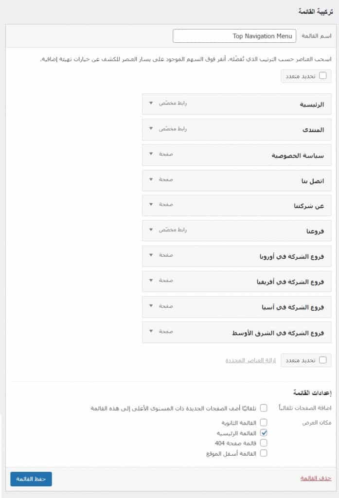 - يمكن إظهار القائمة في أكثر من مكان عرض، إذ يمكنك إظهار قائمة في رأس الموقع (الهيدر)، وإظهار القائمة نفسها في أسفل الموقع (الفوتر)، وذلك عن طريق تحديد أكثر من خيار واحد من خيارات العرض الموجودة في قسم تركيبة القائمة.