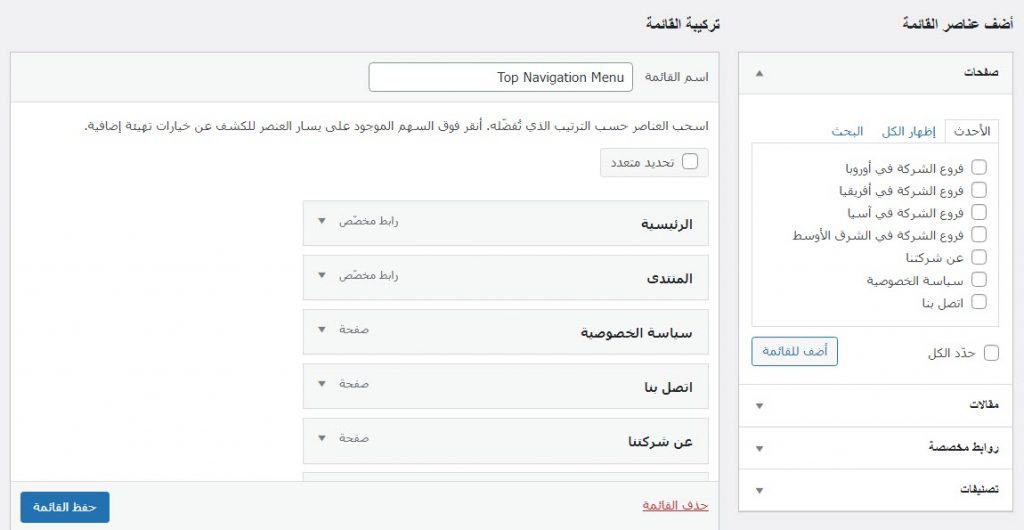 بمجرد تنظيم عناصر القائمة الخاصة بك وتحديد كيفية عرضها مع الإجراءات المختلفة التي يمكنك تنفيذها في قسم بنية القائمة في منطقة إدارة قوائم ووردبريس ، يمكنك النقر فوق الزر (حفظ القائمة) في الزاوية اليسرى السفلية للحفظ و عرضها على موقع الويب الخاص بك.