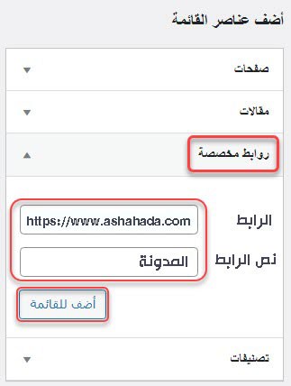 أما بالنسبة لقسم الروابط المخصصة ، فهو يمكّنك من إدراج العناصر التي ، عند النقر عليها ، ستوجهك إلى أي رابط تحدده عن طريق الدخول في الحقل المخصص ، سواء كان رابطًا لصفحة في علامة تبويب معينة في موقعك ، إلى صفحة أو رابط لإحدى المقالات ، أو حتى رابط لصفحة خارجية لا تنتمي إلى مجال موقعك.