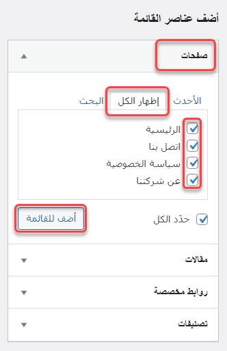 إذا كنت ترغب في إضافة مجموعة من الصفحات ، فحدد الصفحات التي تريد إضافتها من جزء (الصفحات) وانقر فوق الزر (أضف للقائمة) ، إذا كنت تريد إضافة مجموعة من المقالات ، فحدد الصفحات التي تريد إضافتها من جزء المقالات (مقالات) ، انقر فوق الزر (أضف للقائمة) ، وينطبق الشيء نفسه على الفئات.