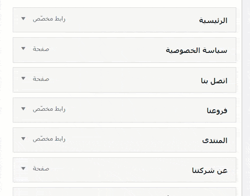 تظهر العناصر في الواجهة الأمامية لموقع الووردبريس بذات الترتيب الذي تظهر به في قسم تركيبة القائمة، ويمكنك تغيير ترتيب ظهور العناصر للزائر عن طريقة تغيير ترتيبها في هذا القسم من خلال السحب والإفلات، حيث تقوم بالضغط على العنصر بزر الفأرة الأيسر مع الاستمرار بالضغط، ثم تقوم بسحبه إلى المكان الذي تريد وضعه فيه.