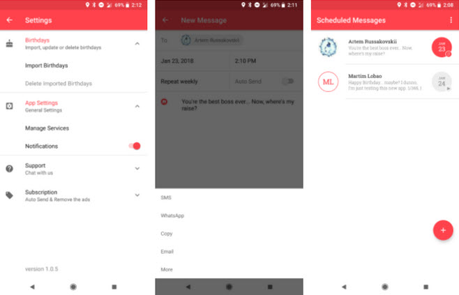مع هذا التطبيق الجديد والمطروح مؤخراً على متجر جوجل بلاى لن تغفل عن إرسال أى رسالة بعد ! نعم، حيث أن التطبيق يساعدك على جدولة أي رسالة وإرسالها تلقائيًا على معظم تطبيقات التراسل الشهيرة كالواتس أب والفيس بوك ماسنجر وتطبيق لاين و تطبيق رسالة SMS إلى غير ذلك وهذا يرجع بفضل أن التطبيق يأتى بمهمة جدولة الرسائل وإرسالها في أي وقت تحدده أنت . هذا، ويتوفر نسختين من التطبيق نسخة مجانية تماماً ولكنها تضم بعض الإعلانات وتدعم كل المميزات المتوفرة فى النسخة المدفوعة بإستثناء فقط ميزة الإرسال التلقائي لرسائل SMS فهذا يتطلب منك الاشتراك الشهري بسعر 0.99$ مع إزالة الإعلانات . [التحميل على GOOGL PLAY]