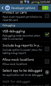 في البداية قم بالدخول إلي Developer Options من على هاتفك وتأكد من وضع علامة صح أمام كلمة USB debugging كما هو موضح في الصورة التالية .