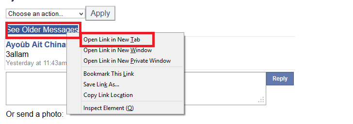وتكمن الخدعة اولا بالإتجاه إلى رابط الفيسبوك الخاص بالهاتف m.facebook.com بعد الدخول إختر الدردشة التي ترغب ان تستعرض كل رسائلها في حاسوبك وانقر على See Older Messages في تبويب جديد كما هو موضح في الصورة اسفله .