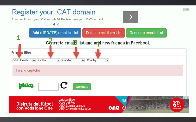 بمجرد الدخول للموقع تختار في الرقم 1 عدد الإيميلات الذي تريد الحصول عليهم ، ثم في الرقم 3 تحدد الذكور أو الإنات ، وأخير في الرقم 4 تحدد الدولة