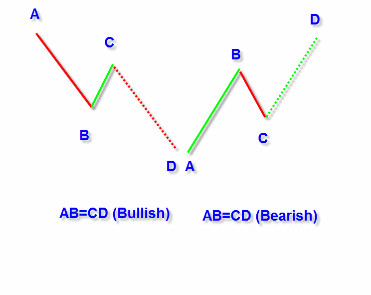 2- نموذج (AB=CD – Bullish) تكون نقطه البدايه A وتبدأ من اعلى الى اسفل ونهايه الهبوط B وهذاهو الضلع الاول من النموذج ثم ياتى بعدها تصحيح لتلك الموجه وتكون بدايتها B وهى من اسفل الى اعلى حتى تصل لنقطه التصحيح حسب نسب الفيبوناتشى وتسمى C ثم يعقبها موجه هابطه تكون بدايتها من C وتنتهى ب D ويكون الضلع CD مساويا للضلع AB فى الطول والمده