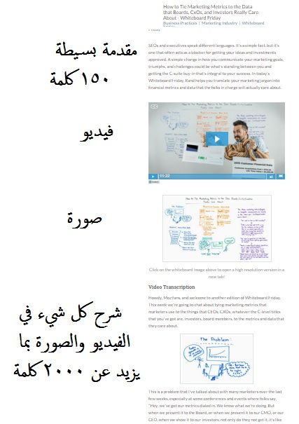 هذا ما نشهده في اغلب المواقع الكبيرة والتي تركز على تجربة المستخدم “USER EXPERIENCE”, حيث نلاحظ في صفحات المواقع وجود الجواب الشافي في بداية المقالة والمتمثل بكلمات بسيطة يرفقه صورة تشرح كل شيء او فيديو, ليحصل الزائر على ما يرديه, بعد ذلك سيجد قسم اسمه “شرح تفصيلي” يتحدث عن كل شيء يخص المجال الذي تتحدث عنه, ولتوضيح هذه الفكرة سنلاحظ طريقة كتابة مقالات Rand في موقع MOZ